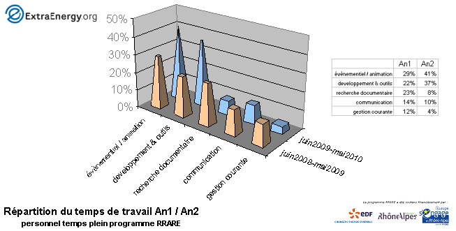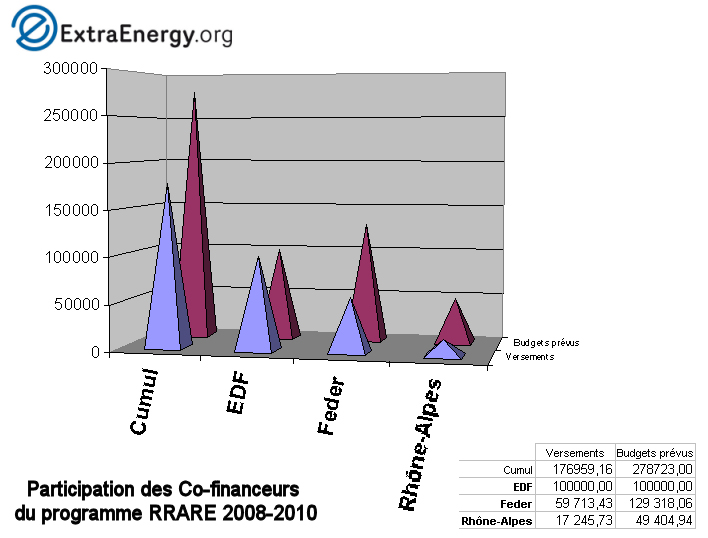 Dans le cadre de la prise en charge des salaires et charges par les co-financeurs, EDF est intervenu en avance sur la première année (juin 2008 / mai 2009) à hauteur de 17.000 euros et le solde par la Région Rhône-Alpes (28,34%) et le Feder (28,33%) sur les dépenses prises en compte. La deuxième année (juin 2009 / mai 2010) a été quand à elle répartie à 93% pour le Feder et 1,45% pour la Région Rhône-Alpes sur les dépenses prises en compte.